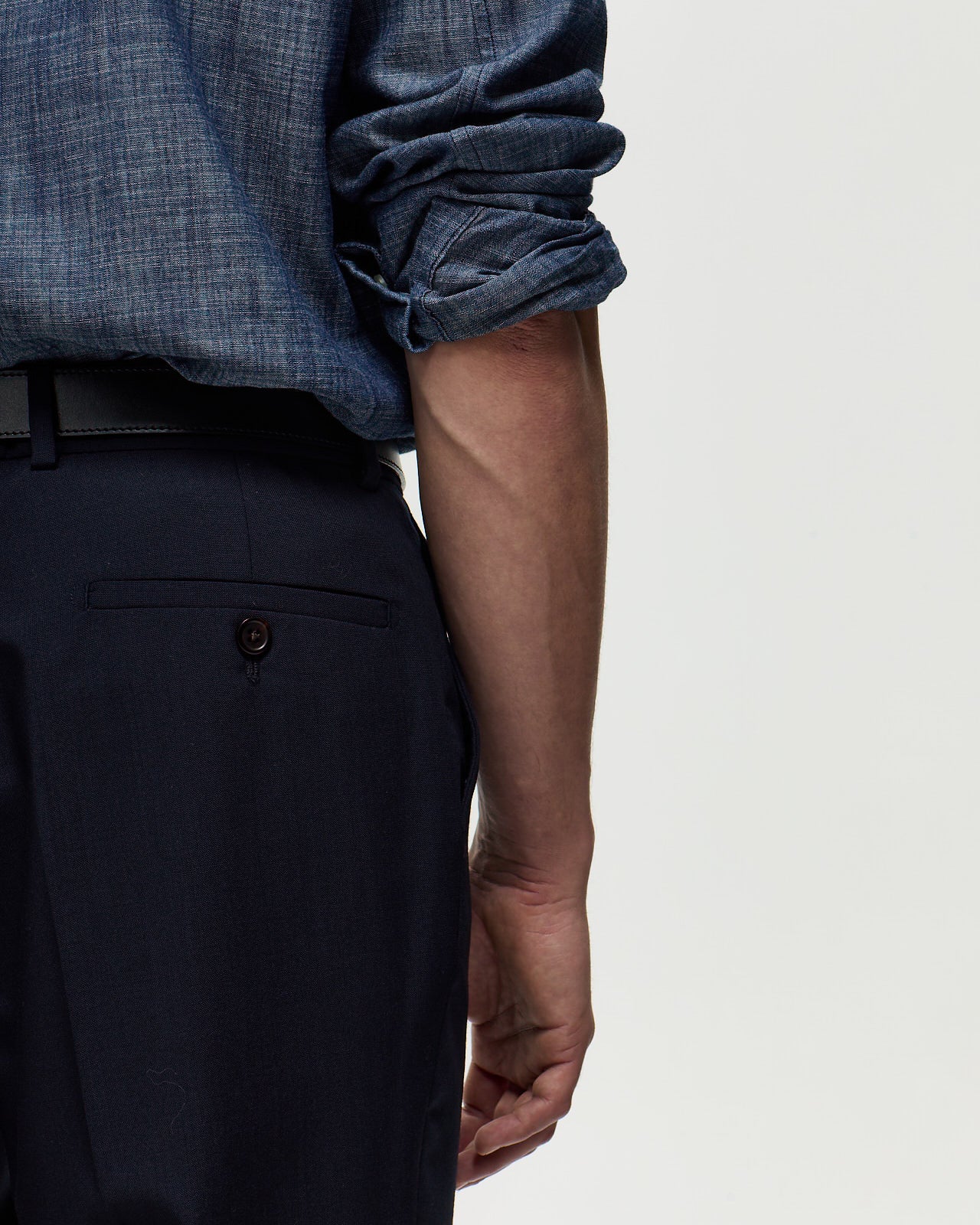 Le costume à veste croisée dans sa version pantalon, fidèle compagnon de cette silhouette d'inspiration britannique. Héritier du vestiaire anglais du 19ème siècle, il arbore fièrement le retour du revers large associé à une coupe droite légèrement ajustée. La laine froide offre cette sensation de fraîcheur si appréciée, dans un tissu italien dont le savoir-faire perdure depuis 1836. Le Navy intemporel confirme son statut d'indémodable. Fabrication marocaine.